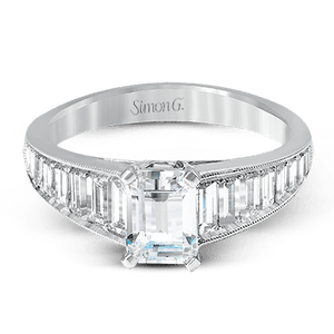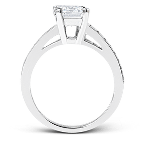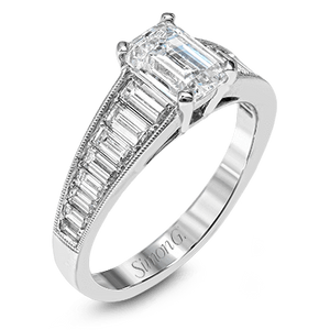If you love emerald-cut diamonds, this setting is a perfect option. The baguette-cut diamonds taper up to the main emerald cut with a beautiful clean transition. You will also find a milled grain detail that gives a ring a truly classic style.
