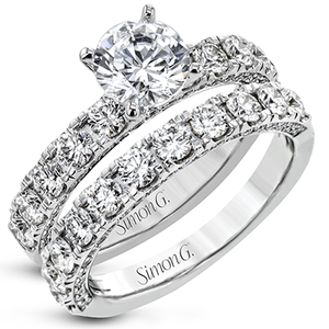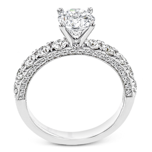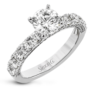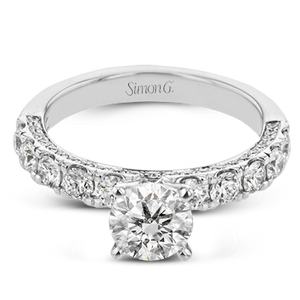 The ring is created in 18 karat white gold, but is also available in platinum. It is set with .97 carats of round diamonds. The ring is designed to hold a round diamond weighing 1.25 carats; however, we can set any size or shape diamond in the setting due to the flexible design. A matching diamond wedding band is sold separately.