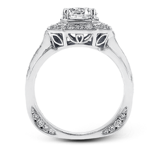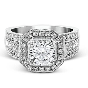 Some women today are tired of the traditional narrow solitaire and want one single ring that serves as their wedding ring. This desire does require a more substantial ring to achieve the look. The stunning ring has a cushion-shaped halo that will accommodate a 1.25-1.50 carat round center. Of course, we can also set it with a cushion-cut center.