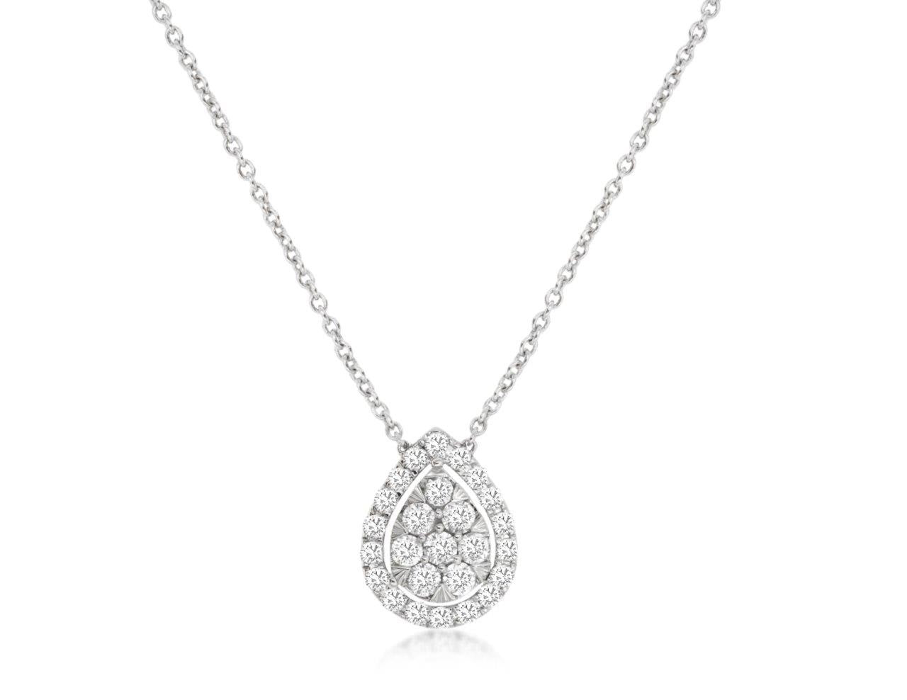This diamond necklace is a beautiful combination of diamonds by the yard with a pear shaped halo pendant. The necklace is an excellent match for anyone looking for halo style pendant to wear every day. You could wear it to the gym, to work, or out to dinner. This necklace is a classic style that pairs perfectly with any outfit and occasion.