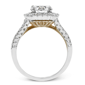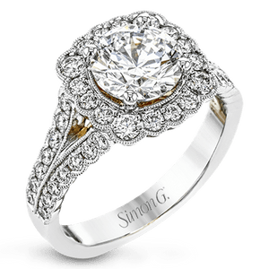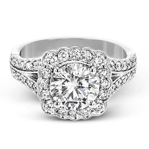 One of our favorite things about Simon G is the continuous addition of new items. This ring is one of those new items. It incorporates the trendy cushion halo design with a split shank down each side. The added detail includes a scalloped edge around each accent stone that protects the diamonds from being knocked out. It also creates a beautiful and unique element not customarily seen in halo-style settings.